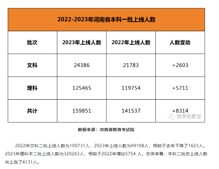 2023年河南省文科本科一批省控线为547分,上线人数为24386人。2022年本科一批省控线为527分,上线人数为23432人。相较于2022年,2023年上线人数增加了2603人。理科本一批2022年省控线为509分,上线人数为119754人。2023年省控线为514,上线人数为125465人,上涨了5711人。总体来看,2023年本科一批文理科上线人数都有所增加,累计增加8314人,但考虑到2023年高考人数的大幅上升,这个数据也并不乐观,本一批的竞争还是非常激烈的。