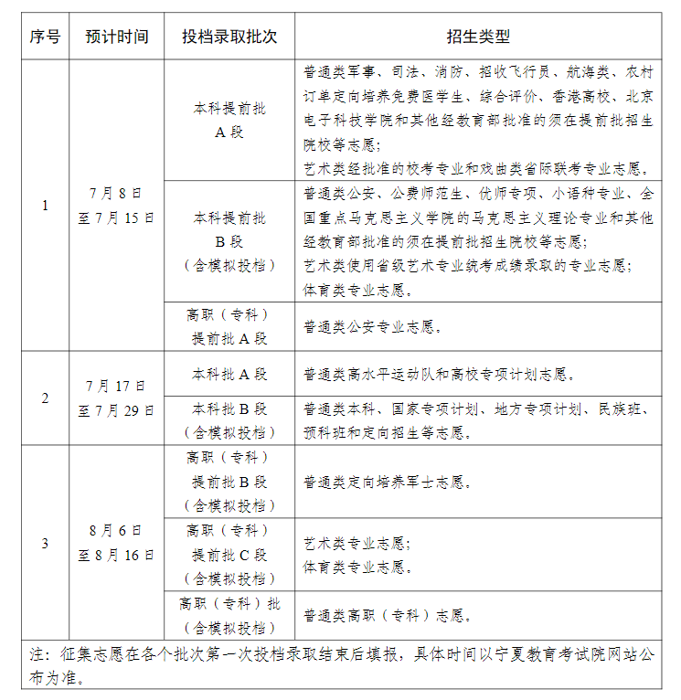 宁夏2025年普通高校招生录取时间安排
