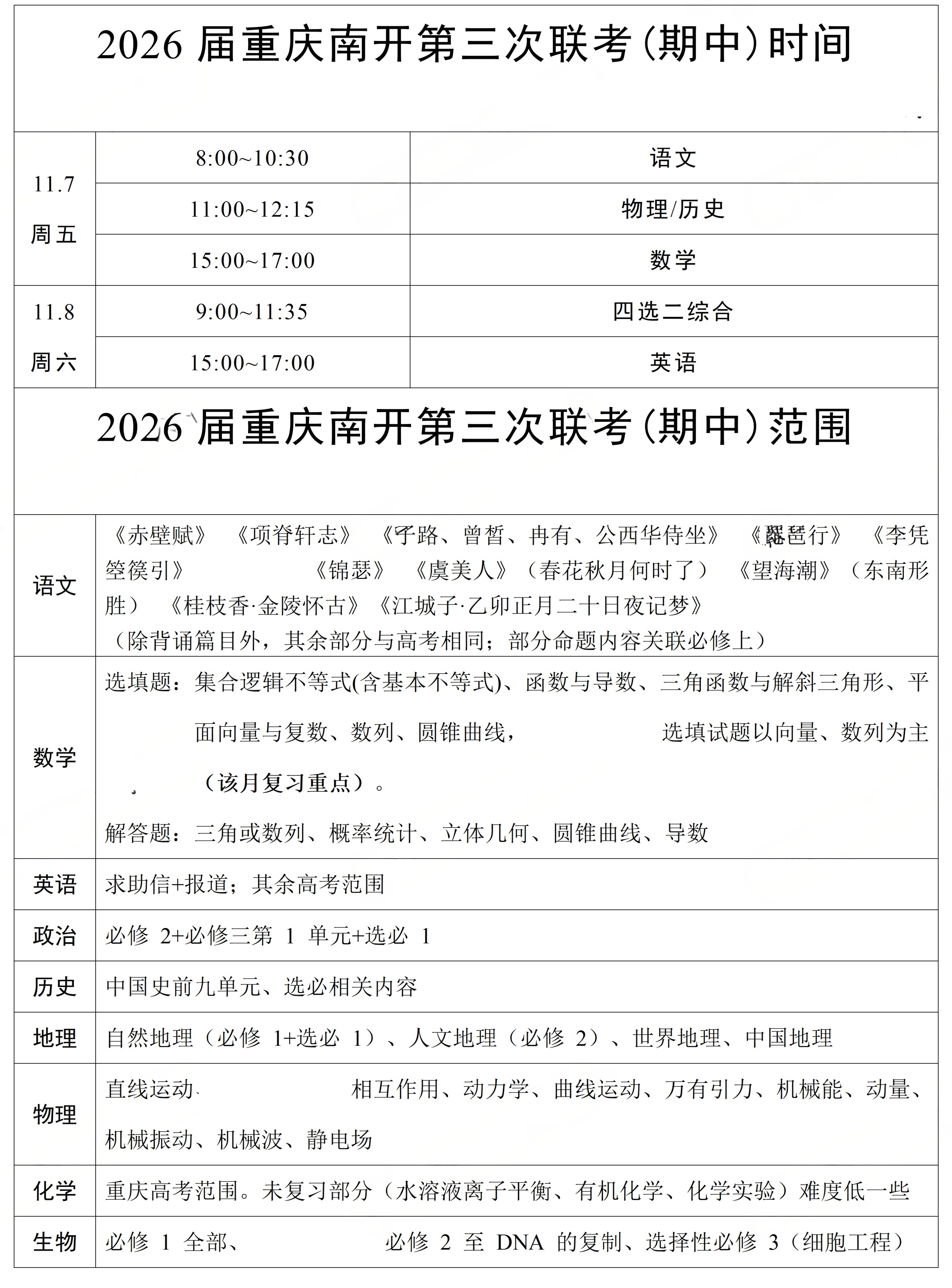 重庆南开中学高2026届高三期中时间及范围出炉