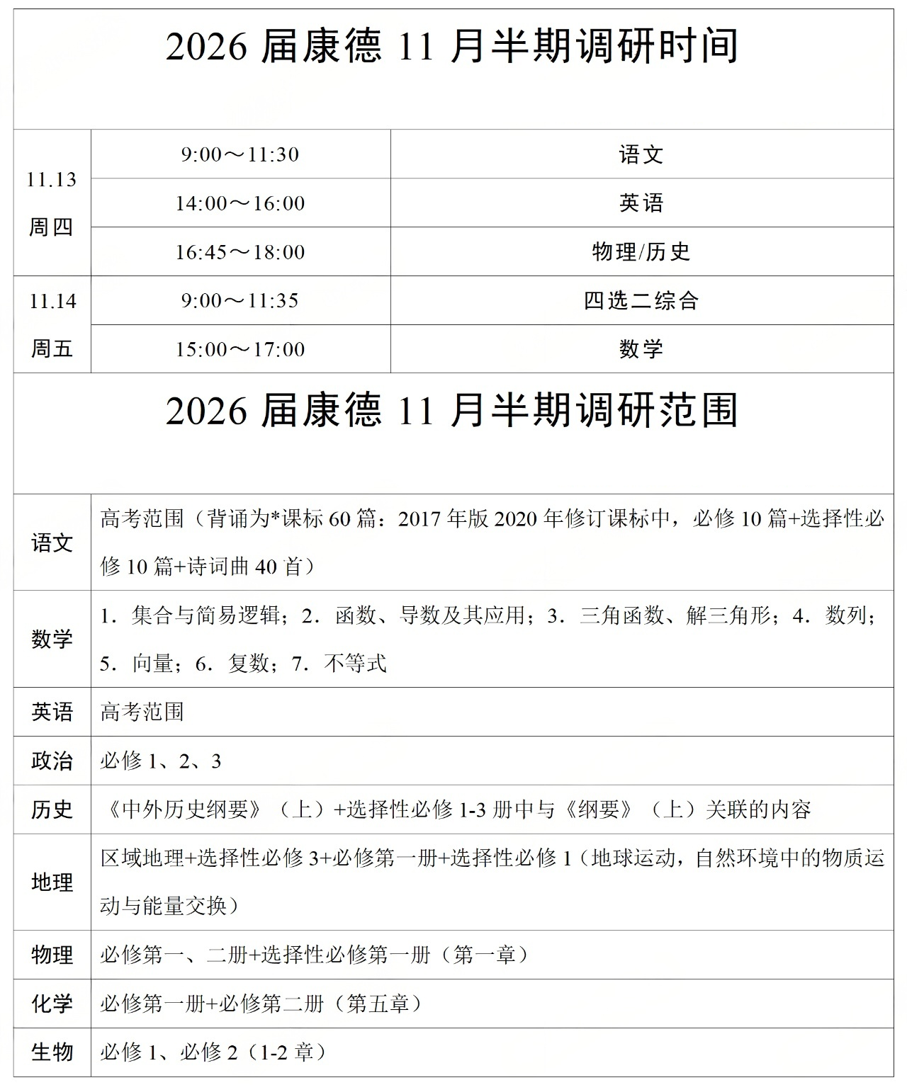 1.考试基本时间:重庆市2026届高三11月半期调研考试,定于2025年11月13日至14日(周四、周五)举行。