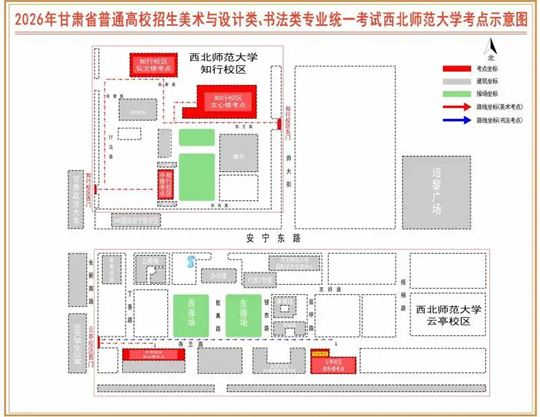 一、考点设置 考点设在西北师范大学云亭校区(地址:兰州市安宁区安宁东路967号)及西北师范大学知行校区(地址:兰州市安宁区邱家湾37号)。 二、考场分布及考生入场安排
