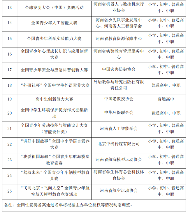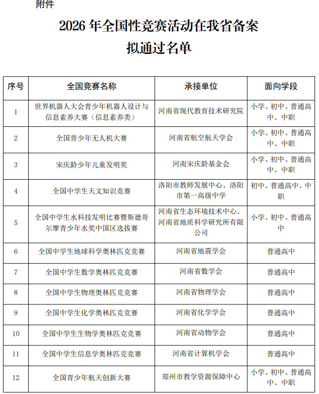 根据《教育部办公厅等四部门关于印发<面向中小学生的全国性竞赛活动管理办法>的通知》和《河南省教育厅等四部门关于印发<河南省面向中小学生的全省性竞赛活动管理办法>的通知》精神,按照《关于启动2026年面向中小学生的全国性竞赛活动在河南省举办分赛区备案受理工作的通告》有关安排,经承办单位(或授权组织实施单位)申请、资格审查、专家审核等程序,拟确定世界机器人大会青少年机器人设计与信息素养大赛(信息素养类)等25项面向中小学生的全国性竞赛活动在河南省举办全省性线下竞赛活动备案通过,各项竞赛活动每年举办不超过1次。现予以公示,公示期为2026年1月22日至1月28日。