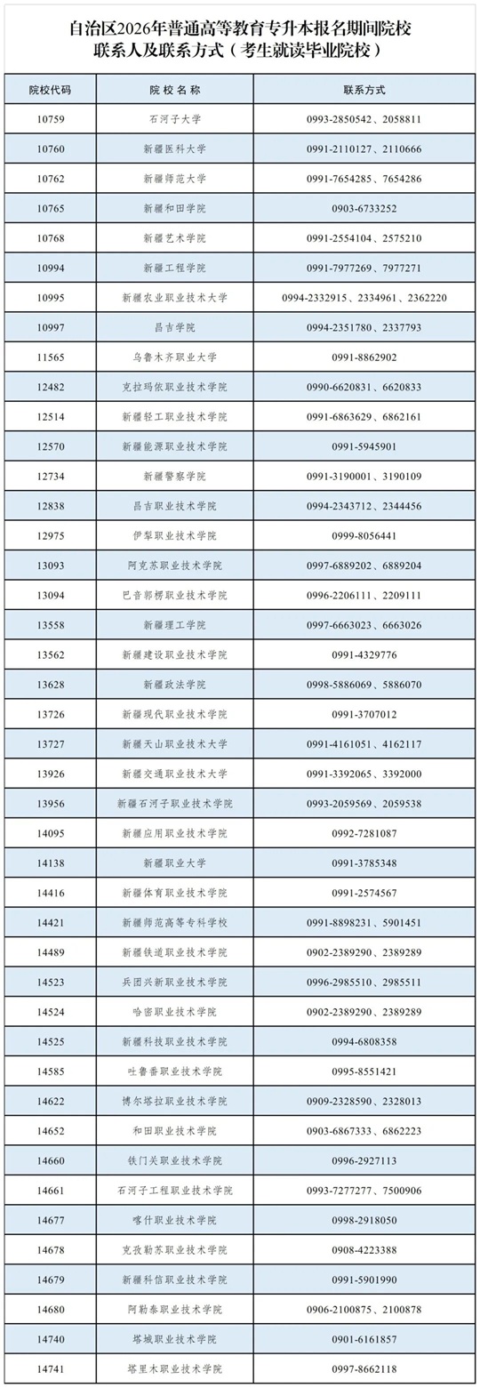 附表:自治区2026年普通高等教育专升本报名期间院校联系人及联系方式(考生就读毕业院校)
