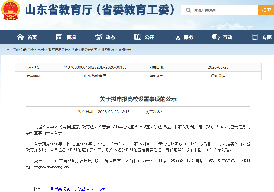 日前,山东省教育厅发布《关于拟申报高校设置事项的公示》。根据《中华人民共和国高等教育法》《普通本科学校设置暂行规定》等法律法规和有关政策规定,现对拟申报的空天信息大学设置事项予以公示。学校官网显示,这是我国第一所以“空天信息”命名的高等院校。