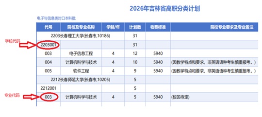 吉林省2026年高职分类计划主要分为两种类型,一是高职单招计划;二是对口升学计划,对口升学计划含对口本科计划和对口专科计划。 计划表中学校代码为七位代码,如下图所示院校名称下方的七位代码。计划表中专业代码为三位代码,如下图所示专业名称前的三位代码。 请考生在查阅招生计划表时,注意计划表的招生类型、层次和相关代码。对于院校具体专业招生录取规则、学费、专业要求等情况,可详询相关院校。