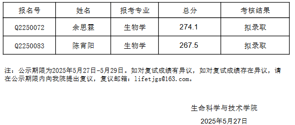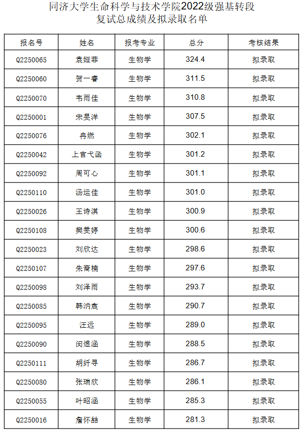 同济大学生命科学与技术学院2022级强基转段复试总成绩及拟录取名单